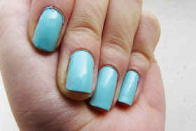 Produkt ma standardowy pędzelek i dość dziwną konsystencję - malując nim, ma się wrażenie, jakby używało się kilkumiesięcznego, lekko zgęstniałego lakieru :( A przecież jest nowy, świeżo kupiony i otwarty. Przez to pozostawia niestety smugi, maluje się nim dosyć ciężko, choć jest dość dobrze napigmentowany i teoretycznie dwie warstwy powinny w zupełności wystarczyć. Nie wiem też, na czym miała polegać jego żelowa formuła - nie dostrzegam żadnej różnicy między nim, a "zwykłymi" lakierami. Rozczarowałam się też trochę, jeśli chodzi o jego kolor - liczyłam na jasny, delikatny błękit, taki jak w buteleczce, niestety na paznokciach lakier okazał się być ciemniejszy i bardziej intensywny, co nie do końca mi odpowiada.